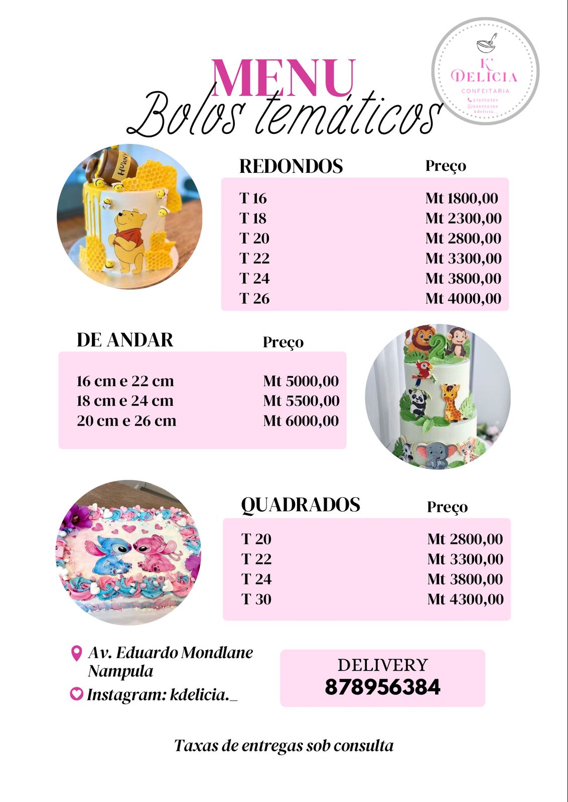 BOLOS E SALGADOS POR ENCOMENDA, APARTIR DE 1800. VEJA OS PREÇOS NO CARTAZ E VARIAM EM FUNÇÃO DO S MODELOS DE TAMANHOS. | SIM |
